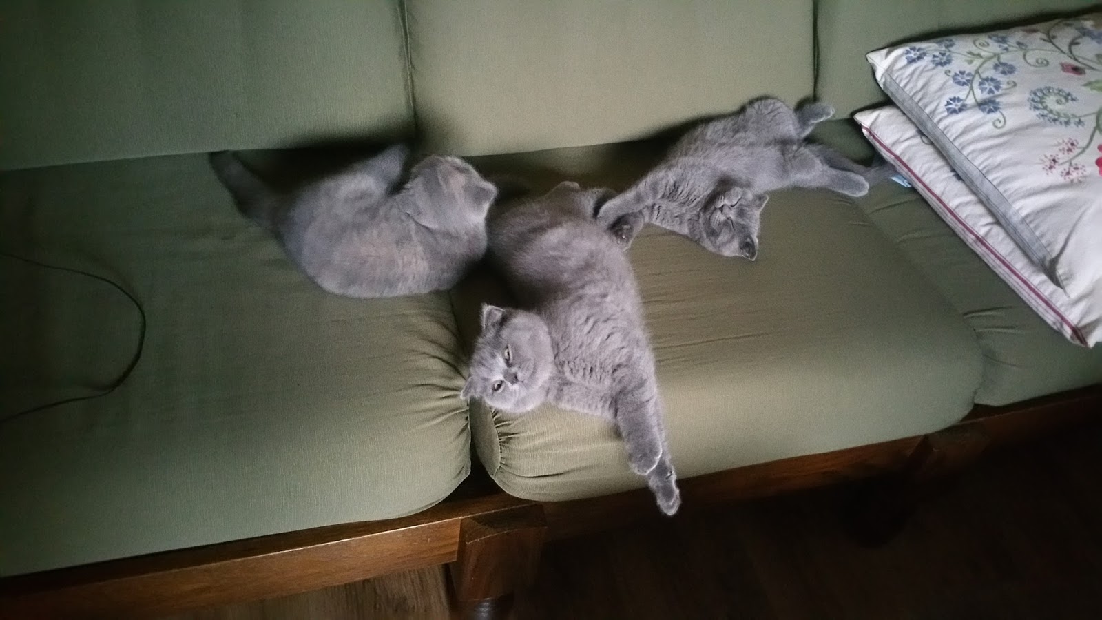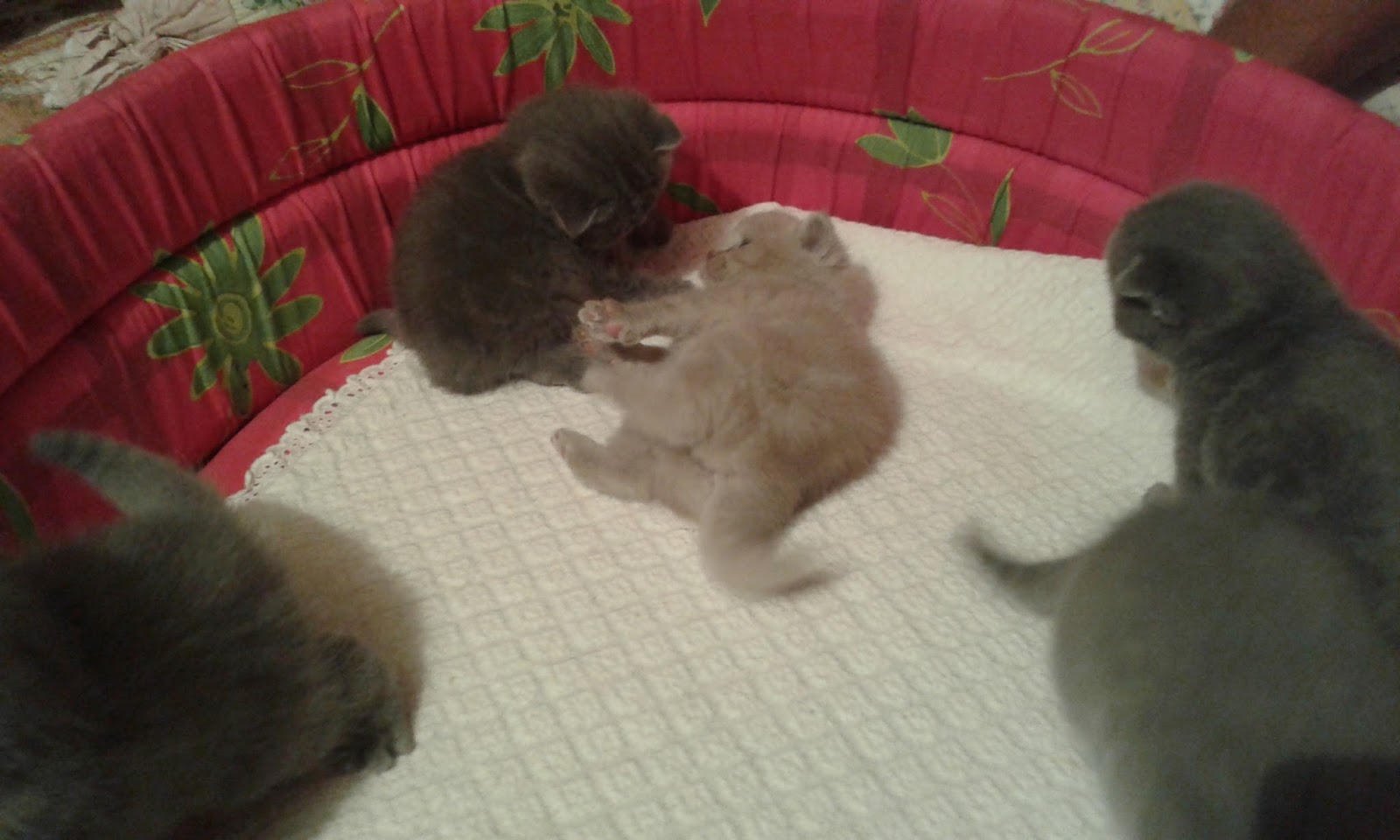 Am fost să-i văd și am plecat luminată de plăcere. Gheme de blană gri, dolofane, cu urechi de Scottish Fold. Botezați cu nume haioase și îngrijiți cu dragoste, cei cinci au sărit din coș și au pornit la drum…prin casă.