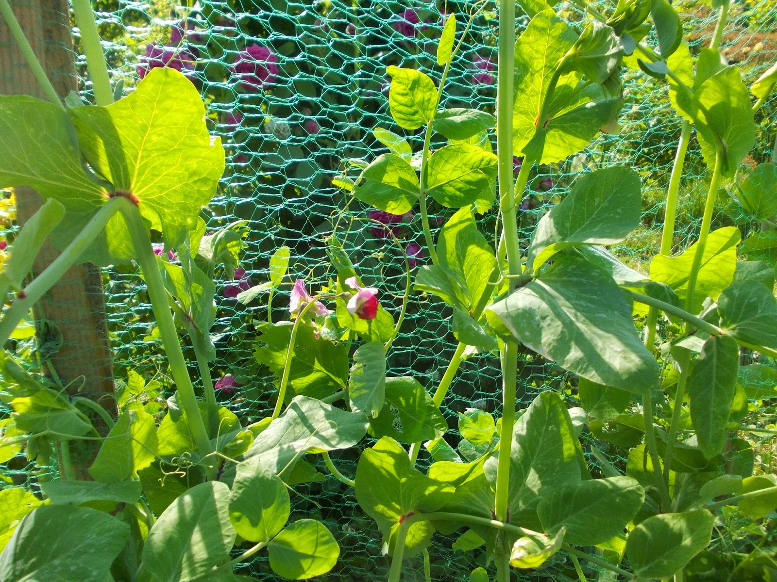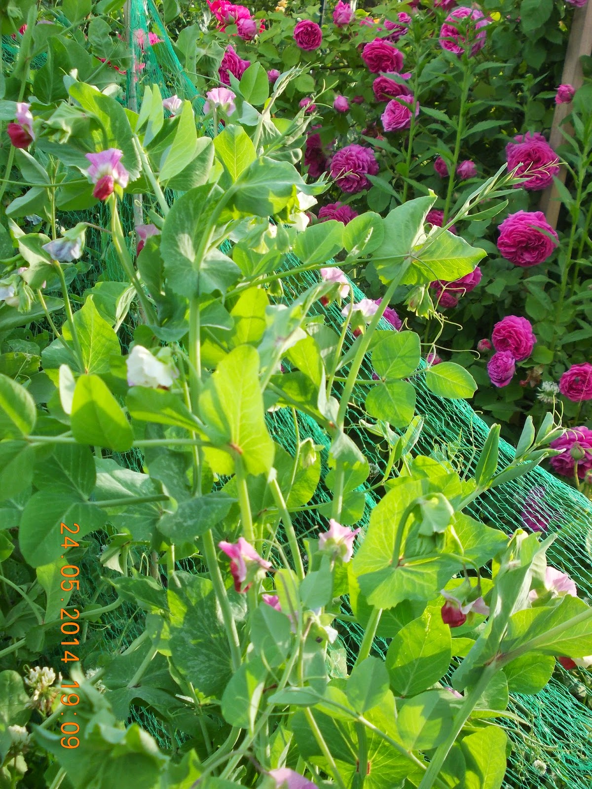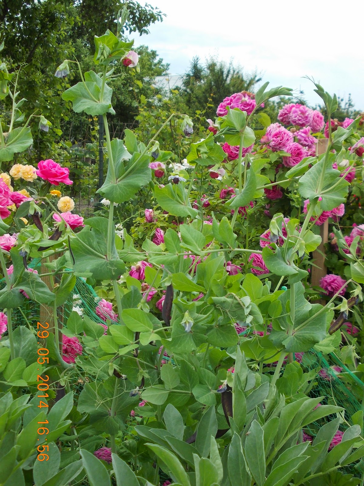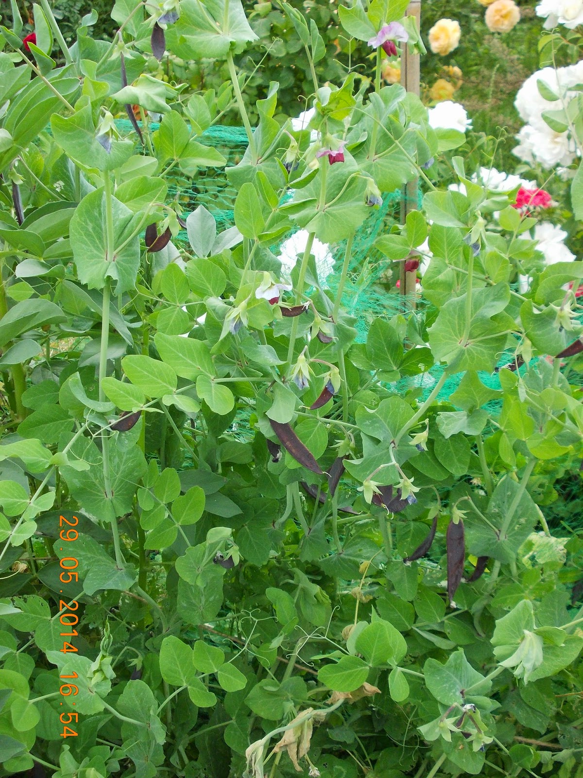 Gardul de plasă ajută plantele să se înalțe către soare și să suporte greutatea păstăilor. Acum mazărea a ajuns la fel de înaltă ca și trandafirii și trebuie să înalț plasa de sprijin. O particularitate a soiului este cerculețul purpuriu colorat ca un guler între frunze și tulpină.