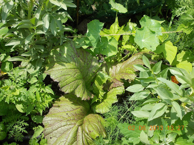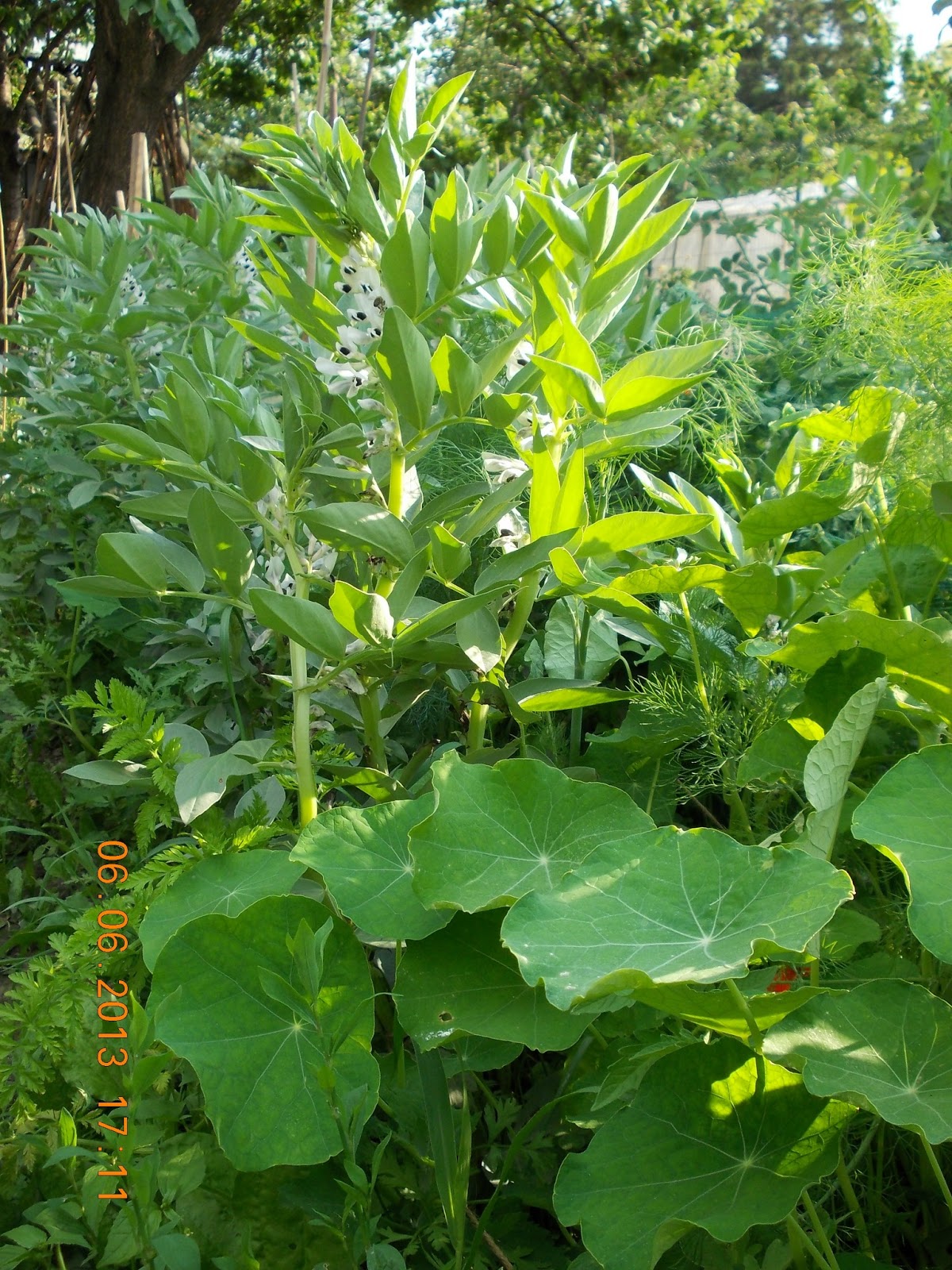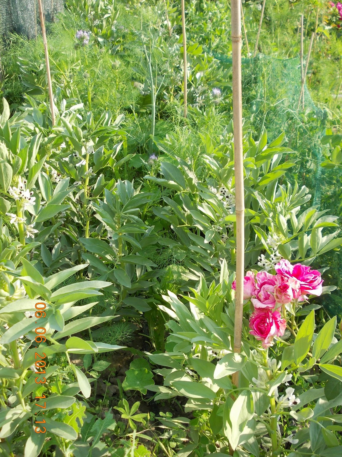 Tot in aceasta parcela am semanat in partea stanga un zid de mazare, iar printre bobi, am pus in pamant, seminte de marar, mustar, lupin, Facelia, Condurul Doamnei, mangold, spanac si o linie fina de fasole pitica.Dupa ce acestea au rasarit si crescut, am sadit intre ele rasadurile de tomate. Am fixat mazarea cu o plasa de sustinere, care o protejeaza de pasari, si astfel am protejat si bobul de zburatoare. Ce am observat de la bun inceput: in aceasta parcela nu s-au dezvoltat buruienile ca in alte parti ale gradinii, nu au mai venit cartitele, si plantele au dezvoltare frumoasa.