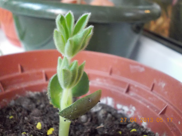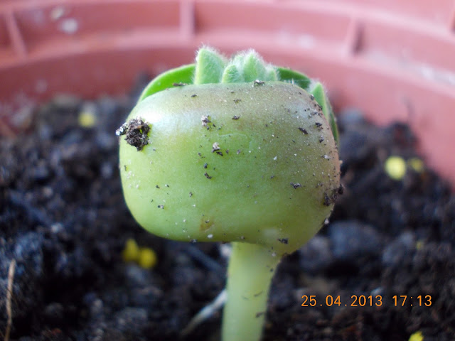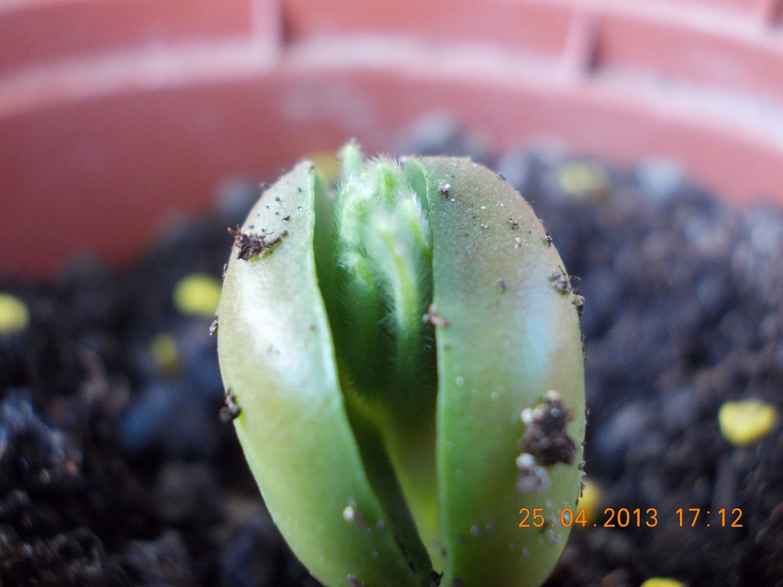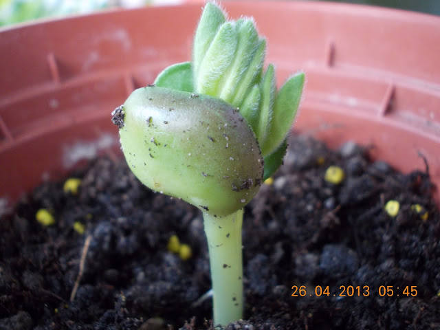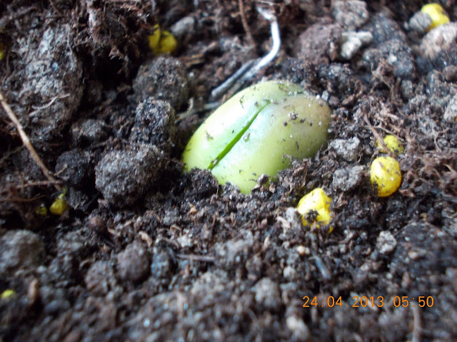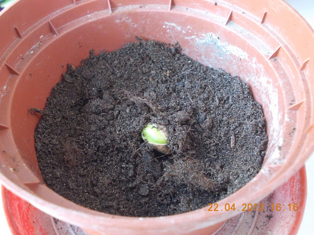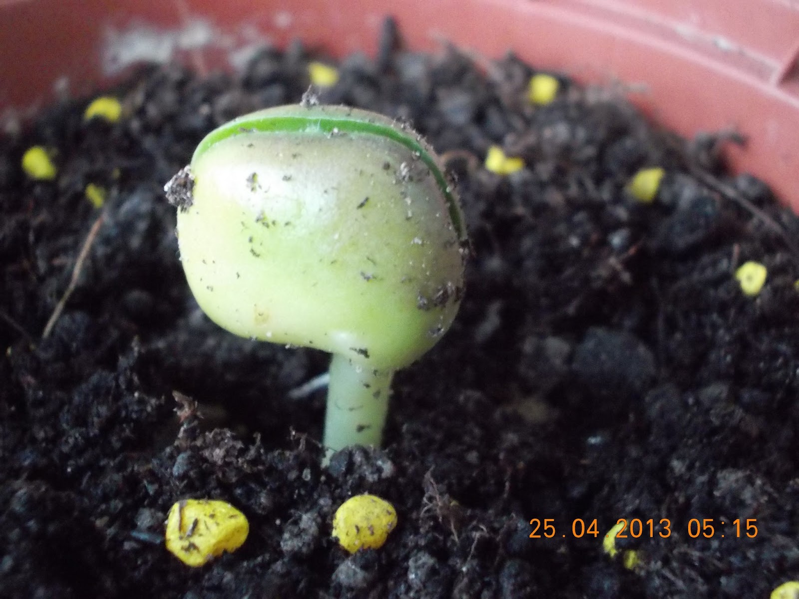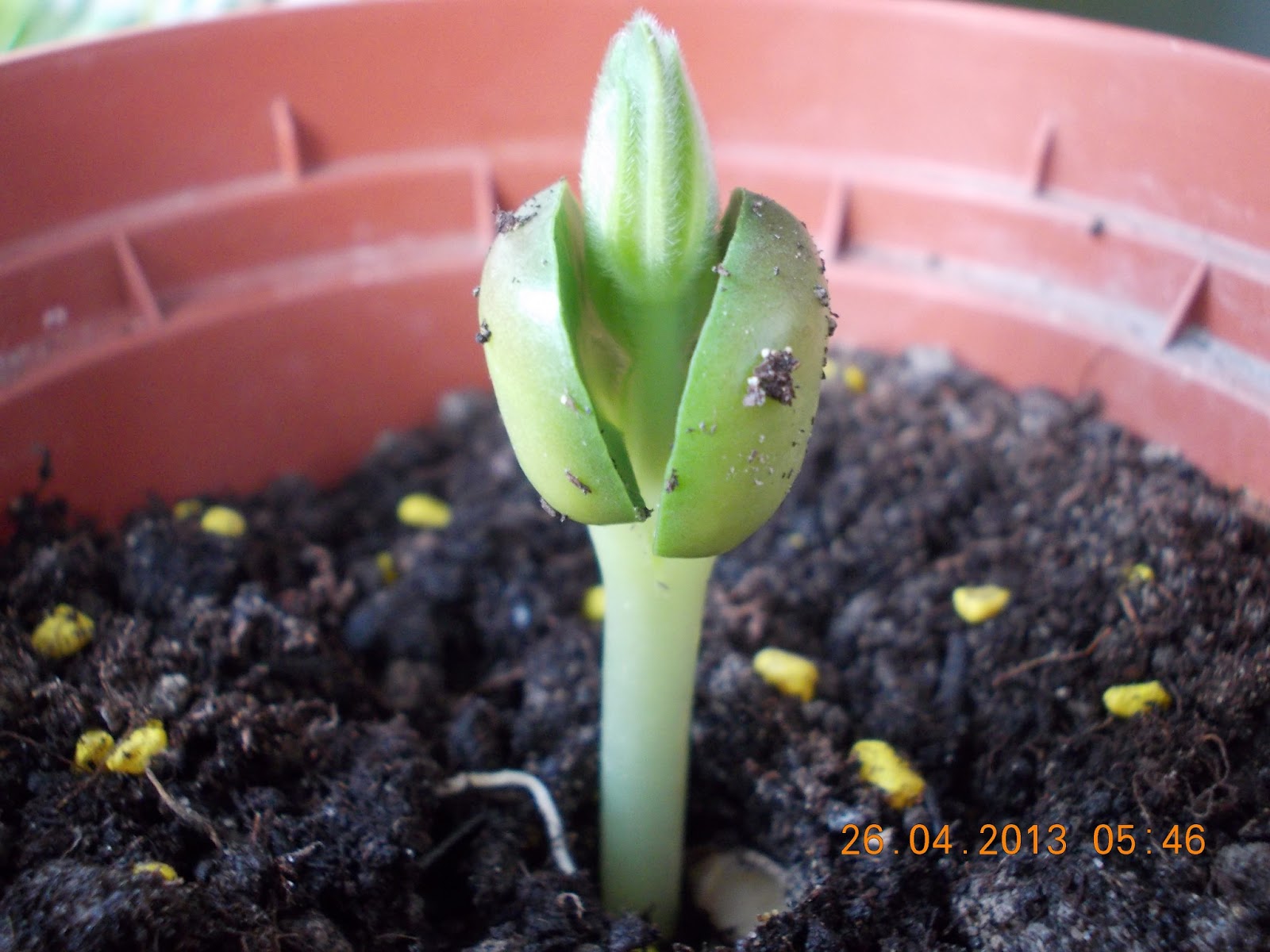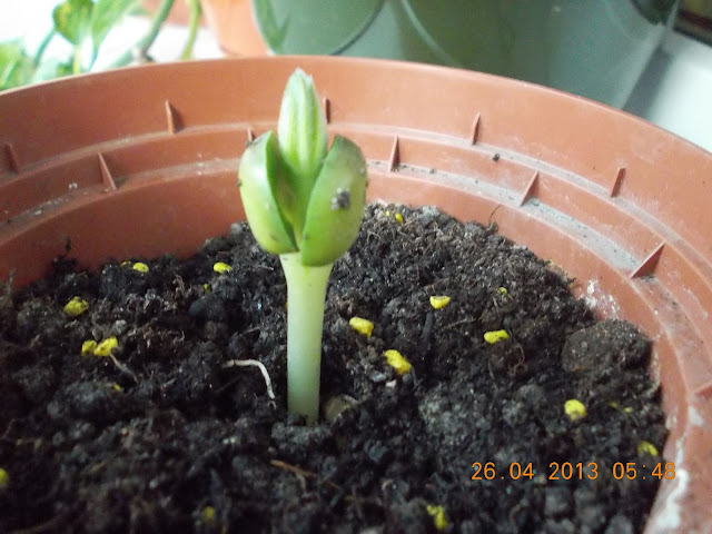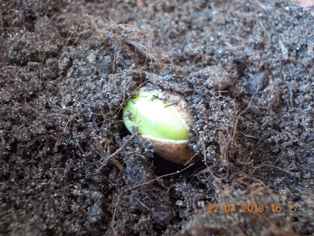 Am scufundat boaba in putin ceai, am lasat-o cam o zi si o noapte si apoi am asezat-o in ghiveci, doar putin acoperita cu ceva firicele de pamant. Peste trei zile, mi-a aratat o fata fistichie, pe langa care, am adaugat treptat pamant, usor umezit.