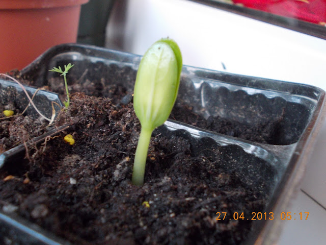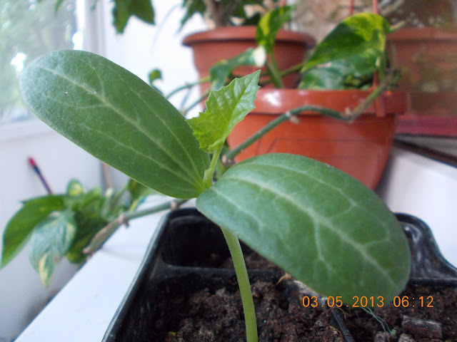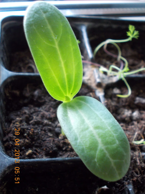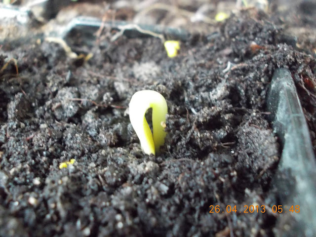 Semintele de Luffa le-am lasat in apa, tot o zi si o noapte, apoi le-am asezat in pamant, acoperite cu un strat de 1 cm de pamant umezit. Am asteptat ceva mai mult, dar aseara se vedea un varf alb verzui si dimineata a aparut acest semn de intrebare.