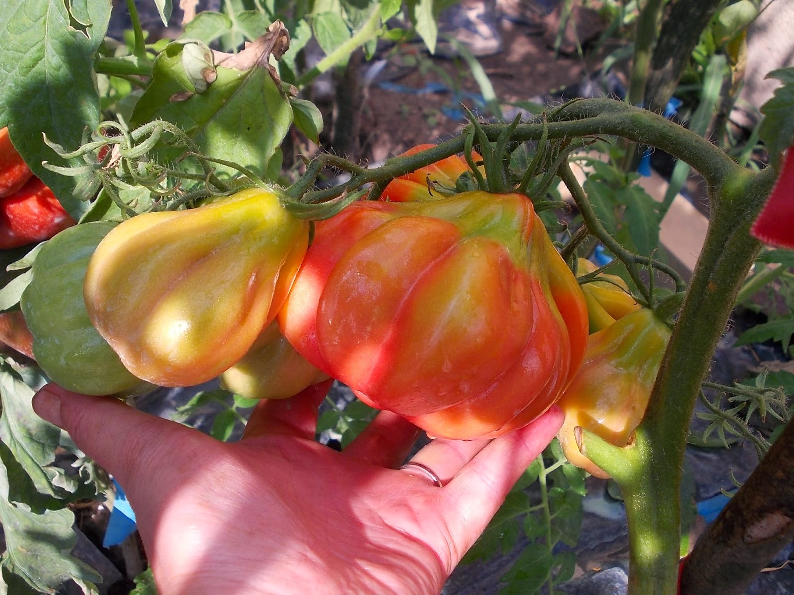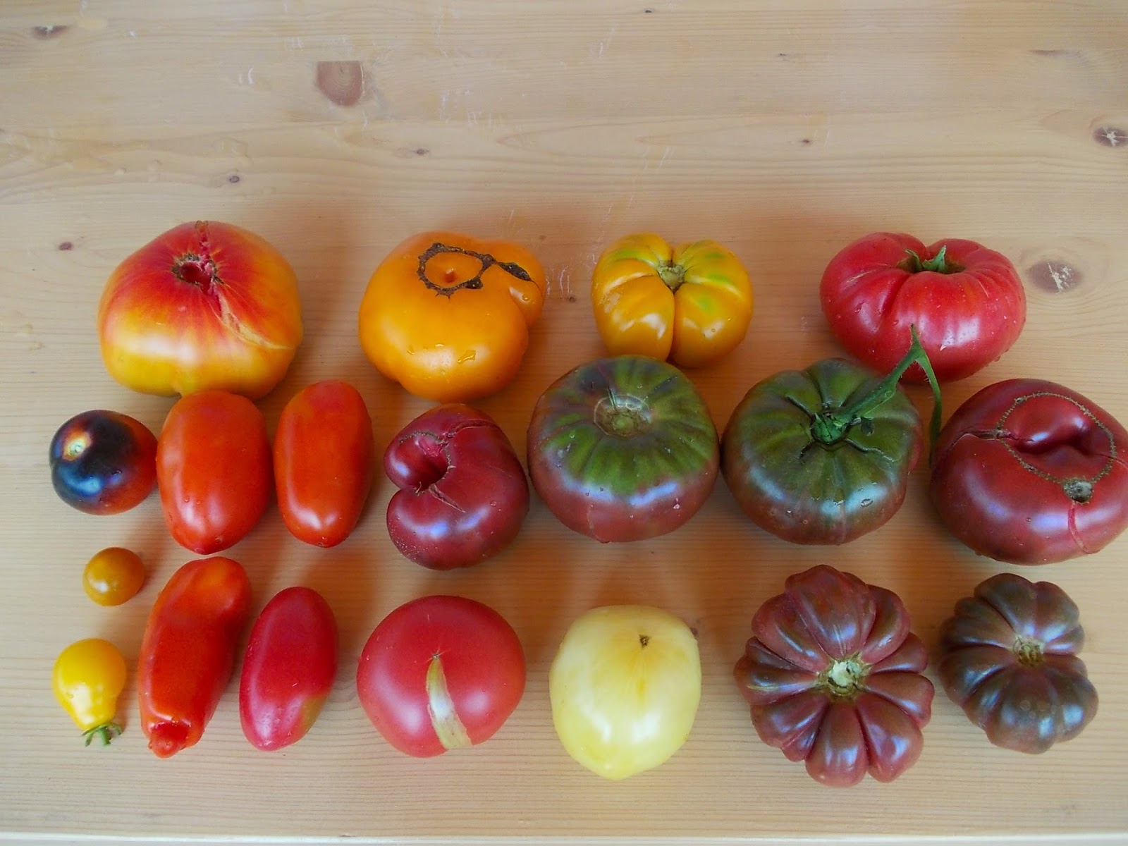 În deschidere avem doi soliști “de culoare”, ba chiar în contrast total, roșia albă și Blue Osu. Cultivată afară în plin soare, Blue Osu a căpătat nuanța de abanos.
