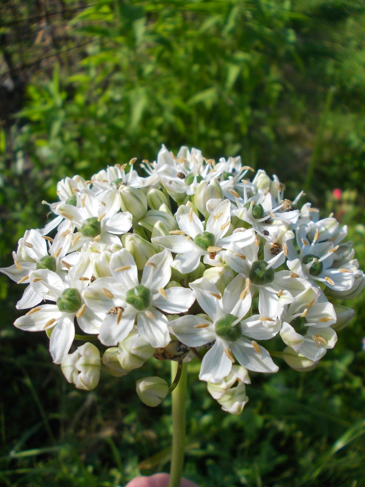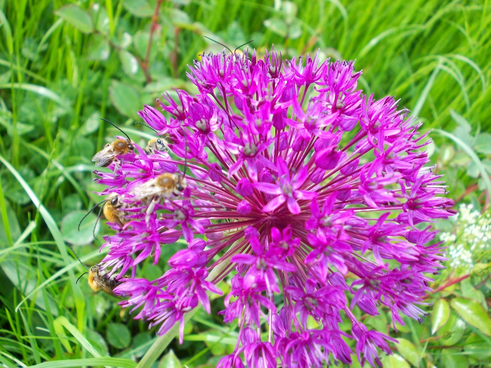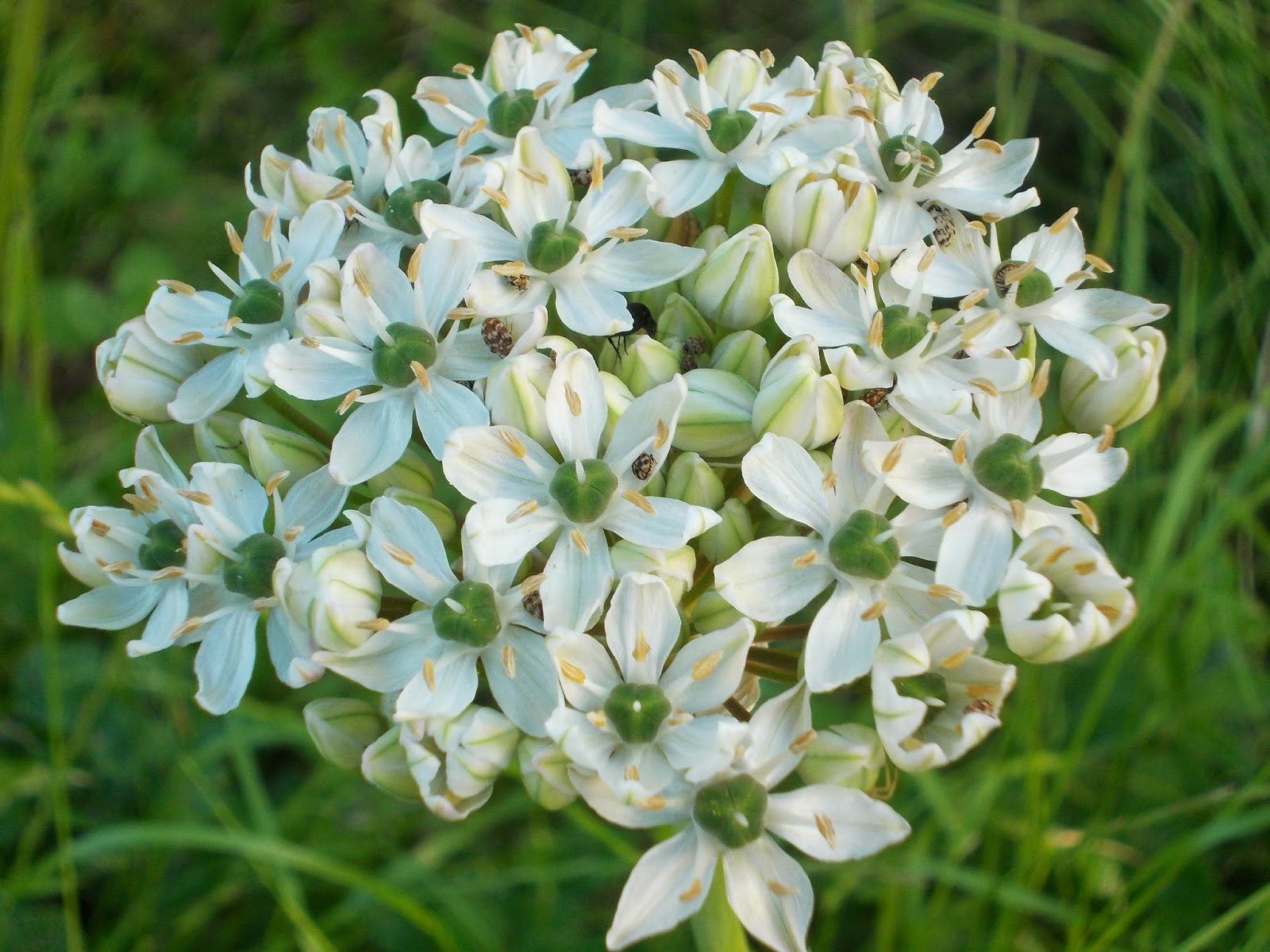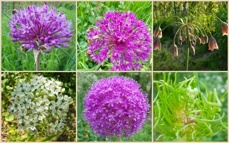 Clopoței crem, umbrele albe cu bumbi verzi, globuri purpurii sau coafuri verzi ciufulite. Bondari, albine, gărgărițe și lupi de albine.
