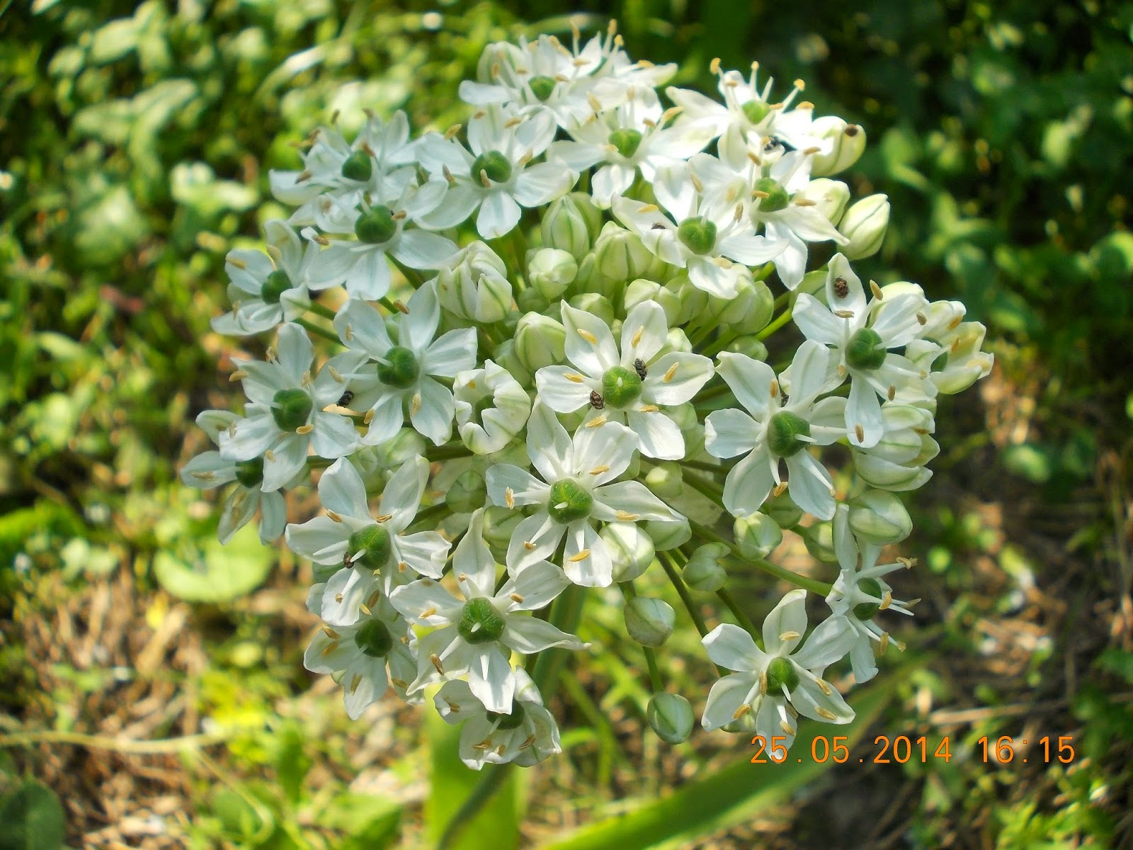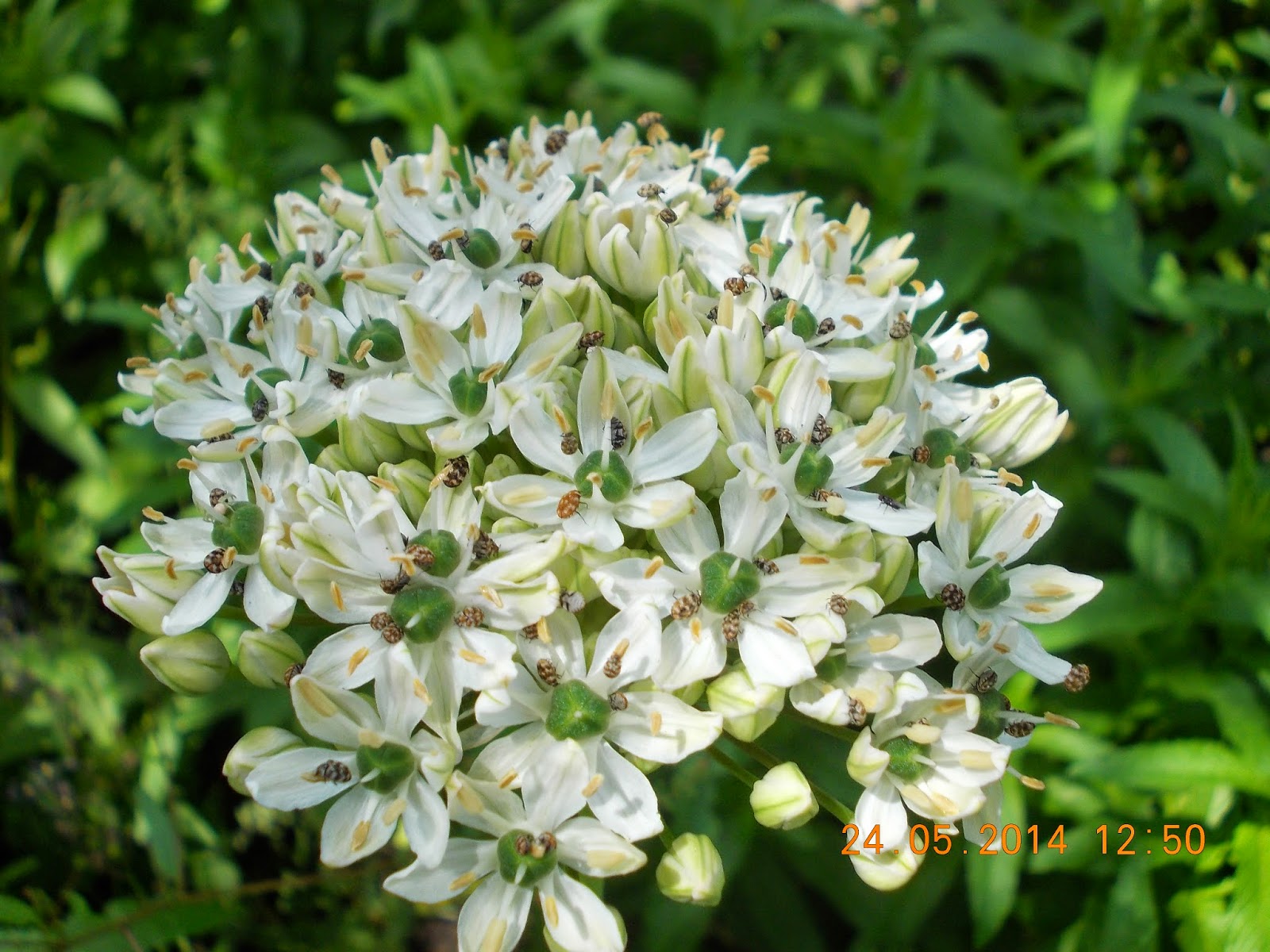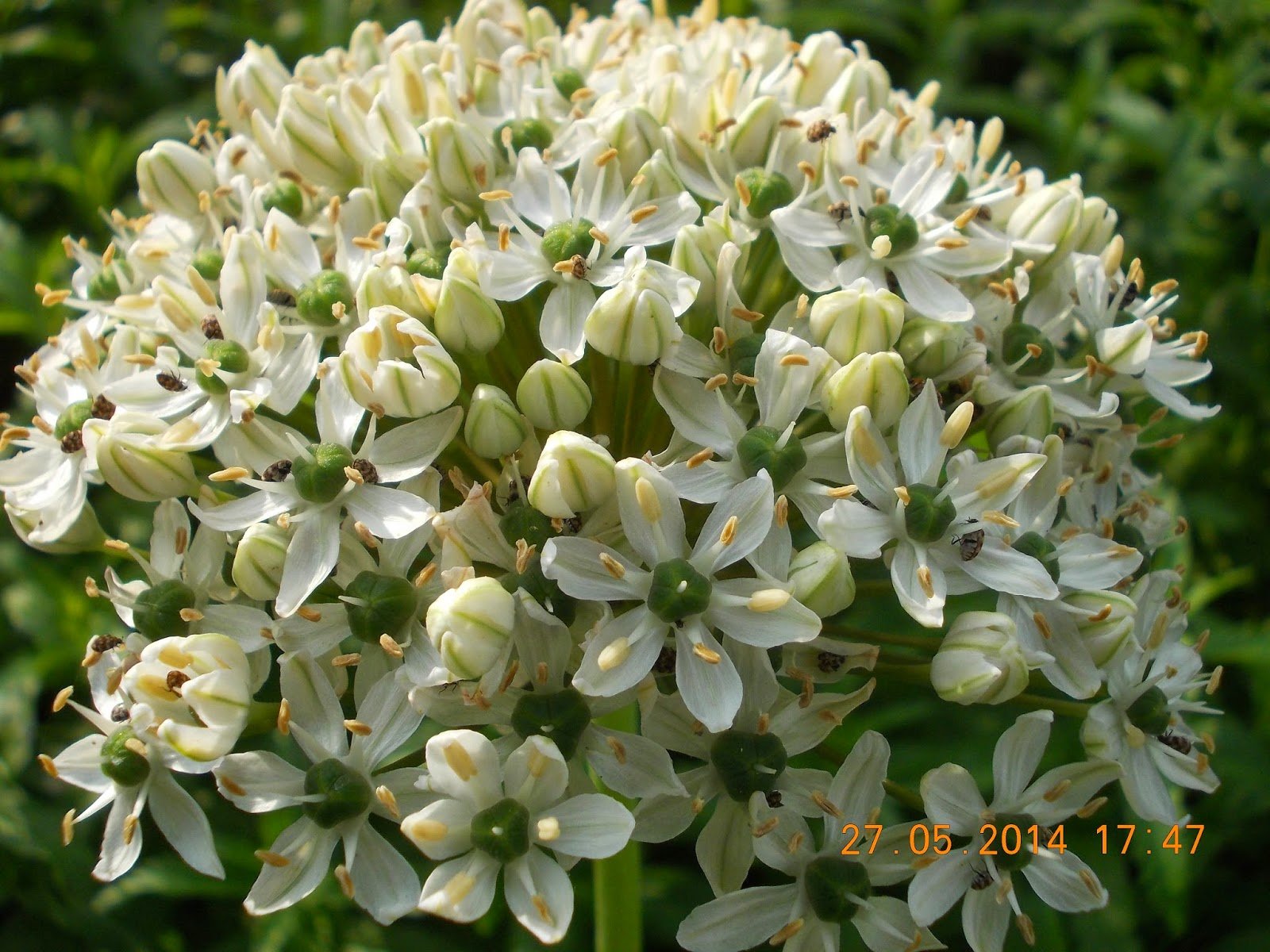 Clopoței crem, umbrele albe cu bumbi verzi, globuri purpurii sau coafuri verzi ciufulite. Bondari, albine, gărgărițe și lupi de albine.