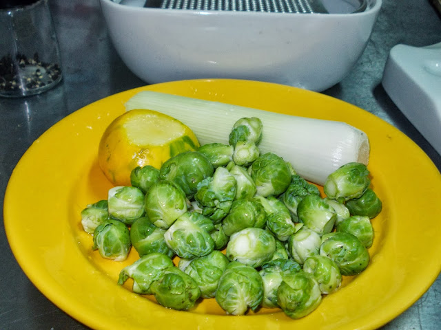 Se topeste untul intr-o cratita mai inalta, se adauga prazul taiat fin, telina taiata felii de 5 mm. grosime si restul de varza de Bruxelles. Se soteaza 5-6 minute fara sa se rumeneasca. Se condimenteaza cu sare, piper si nucsoara. Se adauga cartoful taiat felii, supa de carne, laptele si 2 cani cu apa si se fierb toate ingredientele timp de 45 minute, pana ce verzele sunt foarte moi.