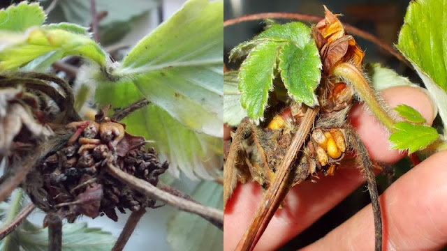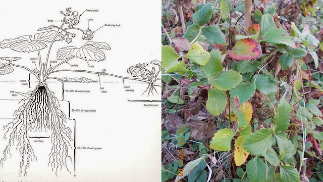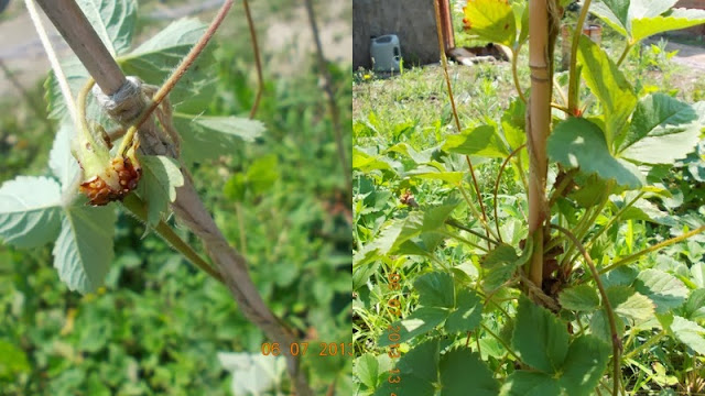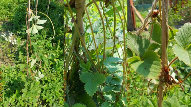 Peste iarna i-am acoperit cu paie si in acest an, devreme in primavara, le-am legat-inaltat filamentele cu noduri formate, pe arac. Rozetele de frunze formate in varf, au crescut radacini proprii si in cateva saptamani aveam stoloni numai buni de plantat in solul pregatit alaturat. Le-am mulcit radacinile cu paie, care au mentinut umiditatea solului, le-am hranit cu ceva hrana organica si macerate pe frunze.