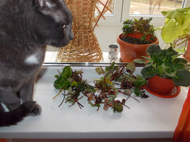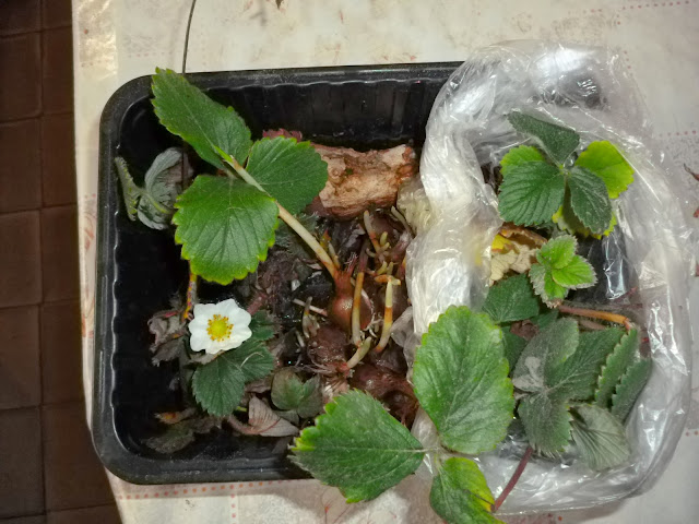stolonii de capsuni primiti de la tine i-am parcat intr-o tavita cu ceva apa,alaturi am pus si o radacina de ghimbir si niste bulbi de crocusi dati de Svet, in asteptare sa ii plantez in ghivece/gradina.