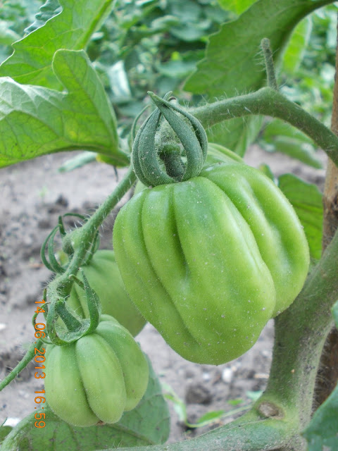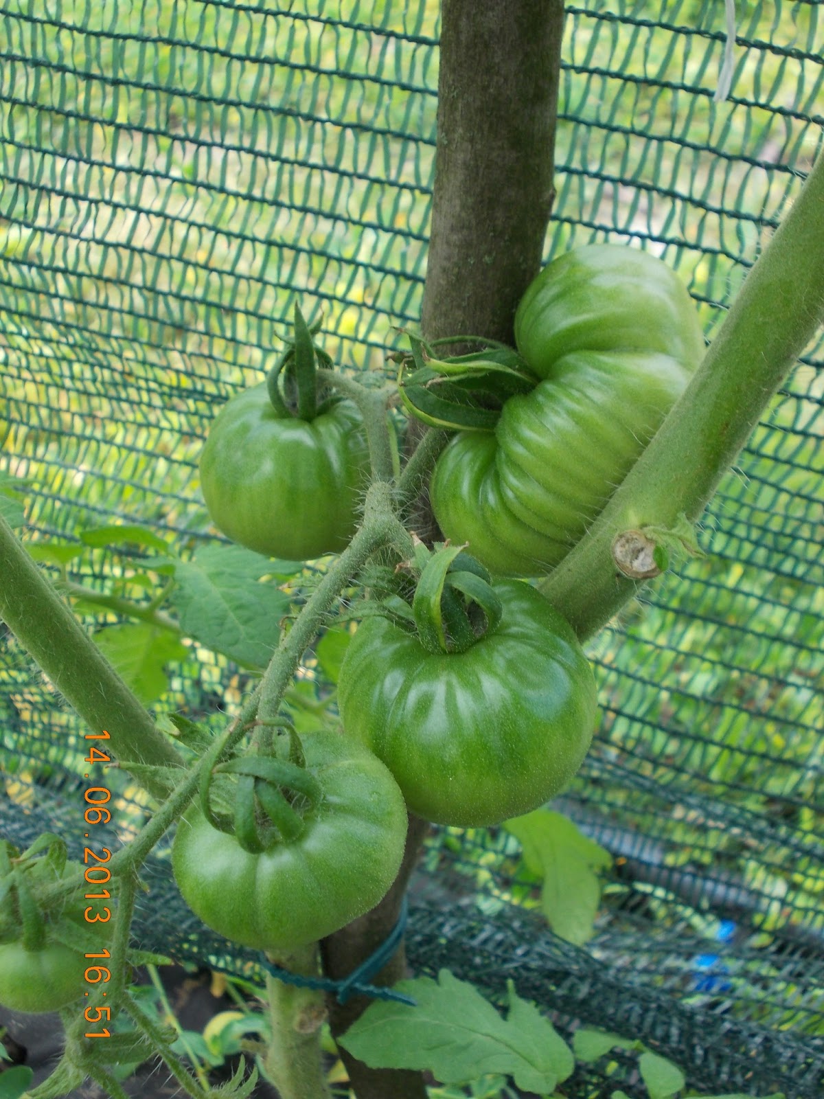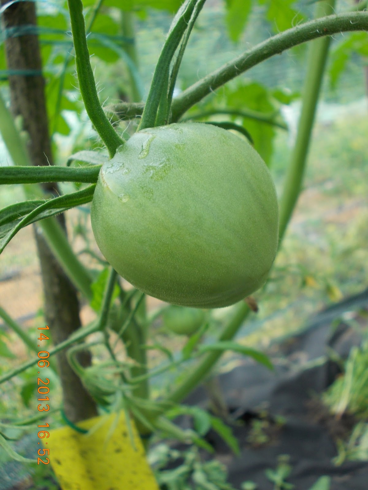 Anul trecut, colegul meu Dan, mi-a adus o rosie, de la socrul sau din Fagaras. I-am pastrat semintele si le-am pus la incoltit in primavara. Acest soi a crescut inalt, are aproape 1,60 m inaltime si a fost primul care a fructificat. Fructul sau este rotund, fara pliuri, verde deschis. A fost prima planta pe care am defoliat-o, ramurile sale atarnau grele si era plina de flori. I-am afanat radacina si am continuat hranirea cu macerat de urzica si coada calului. Impotriva insectelor am folosit macerat din copilii si frunzele rosilor, iar pentru fruct, am pus la radacina si am aplicat pe frunze, maceratul din frunza si tulpina de loboda.