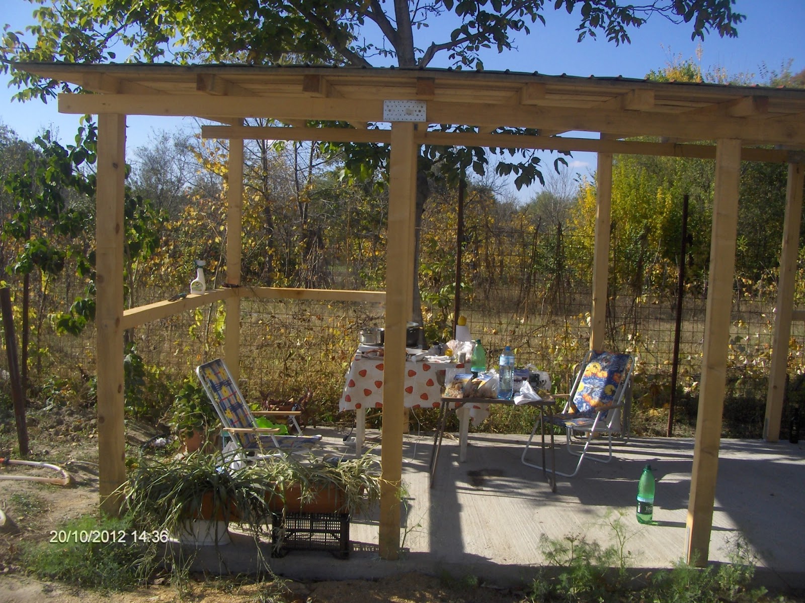La final a venit si Varul cel bun si dupa ce a facut o inspectie drastica, a mai adaugat niste clame solide pe interiorul lemnului de sustinere , erau necesare pentru o fixare mai zdravana. Am mutat aici toata echipa noastra pana toamna tarziu , departe de zgomotul strazii, langa parau si padure. Imi spunea o prietena ca are o senzatie placuta cand priveste imaginile din gradina noastra, pai cred ca venea spre ea aroma de supa de praz pregatita la aragazul de campanie. Deci definitivam si foisorul si plantam si niste glicina, cred ca se potriveste cu decorul si cu Falstafii plantati prin apropiere.