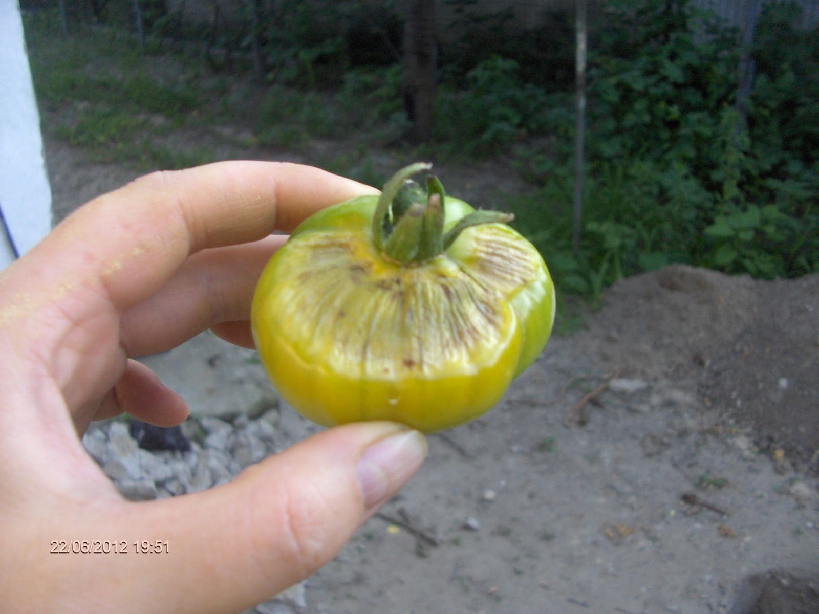 La inceput, chiar in luna Iunie daca ma gandesc bine, nu am stiut ce reprezinta pata aceasta, am crezut ca este un mucegai, apoi am aflat ca este tesutul deteriorat, ars de soare si am pus plasele de umbrire. Mai greu a fost la rosiile cu crestere nedeterminata, care erau foarte inalte si mai greu de acoperit. In timpul secetei am observat ca lor le trebuie o atentie speciala, afanarea si aerarea radacinii si pentru marirea rezistentei am facut un amestec de drojdie de bere, purin de buruieni felurite si urzici, cenusa, infuzie din foi de ceapa si coji de banane si l-am turnat la radacina. Planta se invioreaza rapid si fructele se coloreaza mai repede.