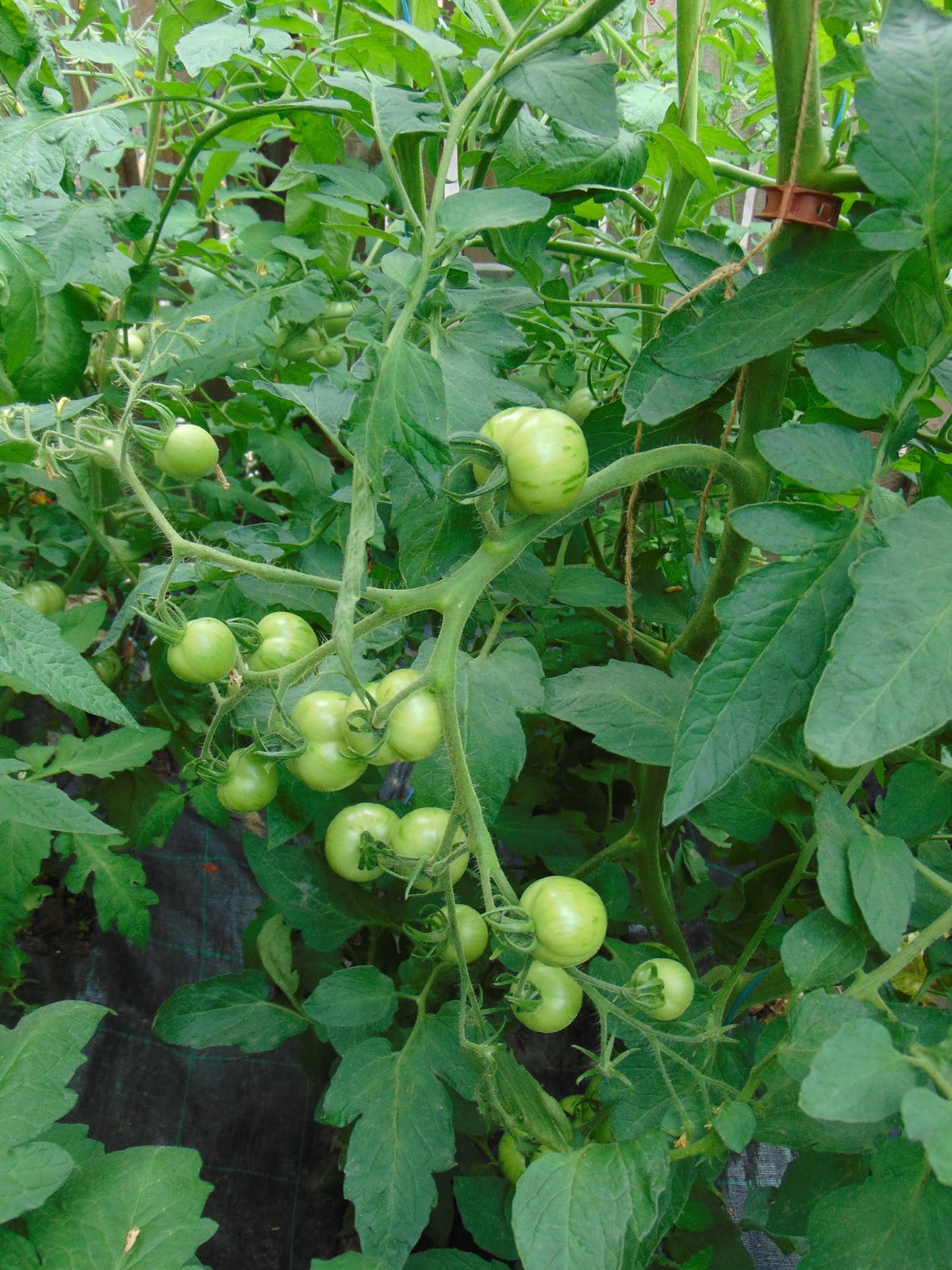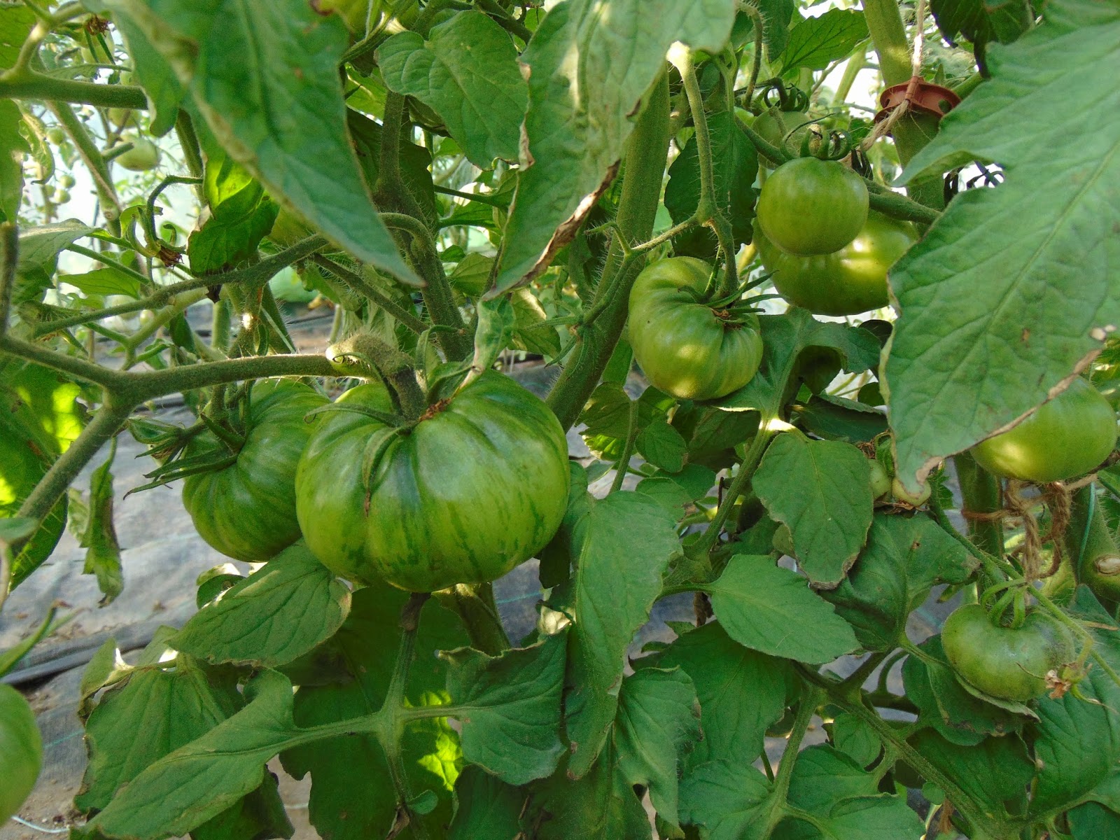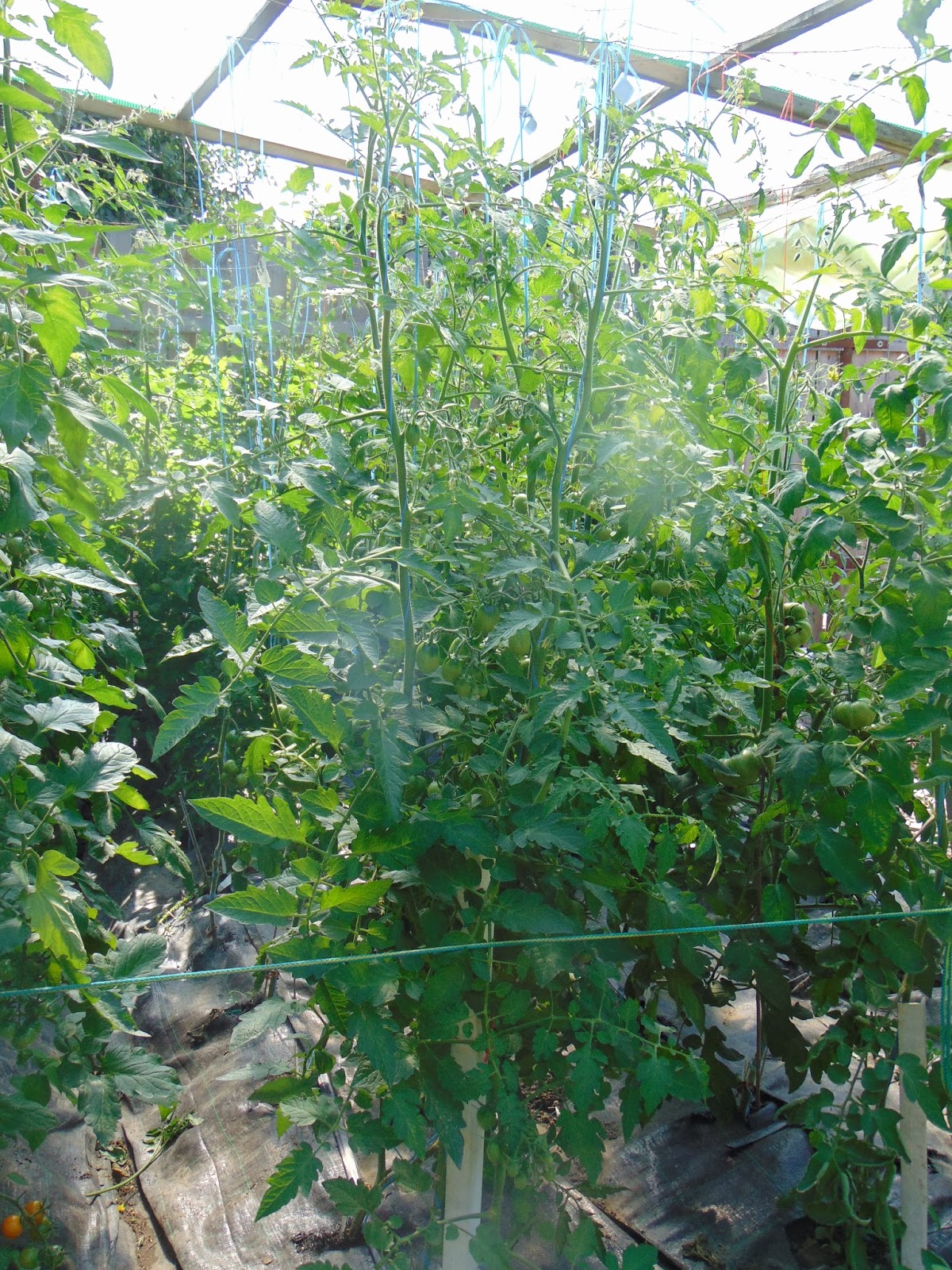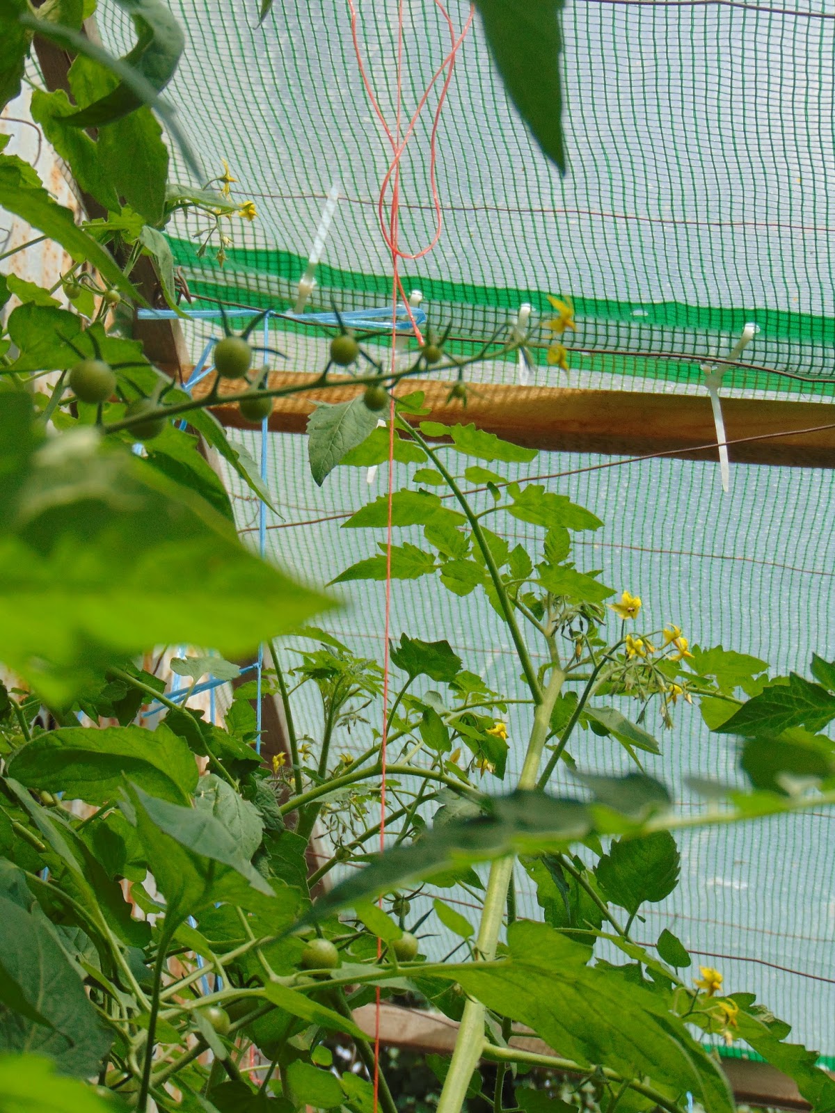 Am avut mari emoții când șantierul din curte a ajuns până lângă roșii dar băieții (muncitorii) mi-au înțeles îngrijorarea și au sprijinit cu mânile peretele de lângă roșii care a trebuit dărâmat. Le mulțumesc și pe această cale. Ca o concluzie bazată pe doi ani de observație, roșiile iubesc adăpostul. Sunt la fel de mari ca în seră, la fel de viguroase, dar parcă cu un rod mai bogat. Acum au deja trei metri, și mai au de crescut, probabil voi înlătura acoperișul, cât de curând.