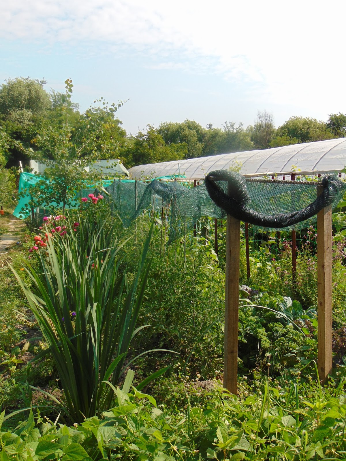 Spalieri la capete de rând, sârme întinse, roșii legate pe firul de sârmă. Sunt alternate cu porumb și floarea soarelui. Deasupra am pus plasă de umbrire, astfel încât trecerea de la umbră la soare este treptată, dușurile reci ale ploilor sunt atenuate. Roșiile sunt ca în stațiune. De remarcat „cocul frigian” de la cap de rând.