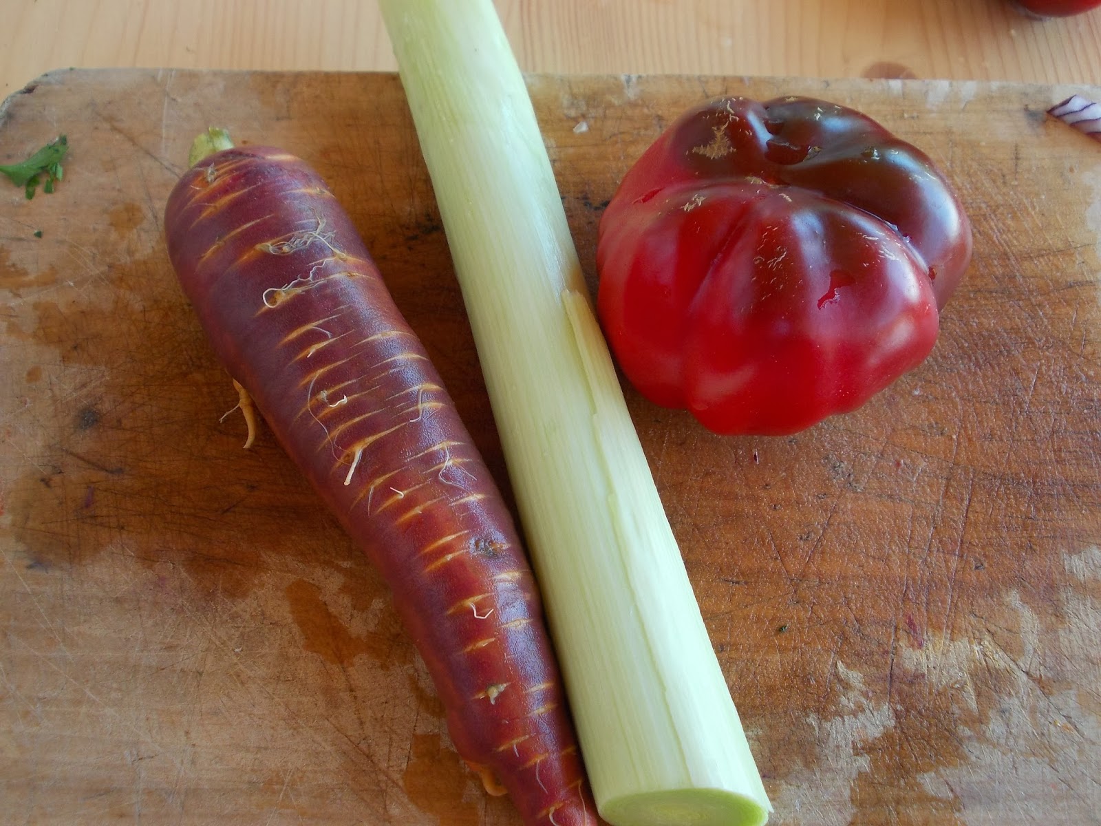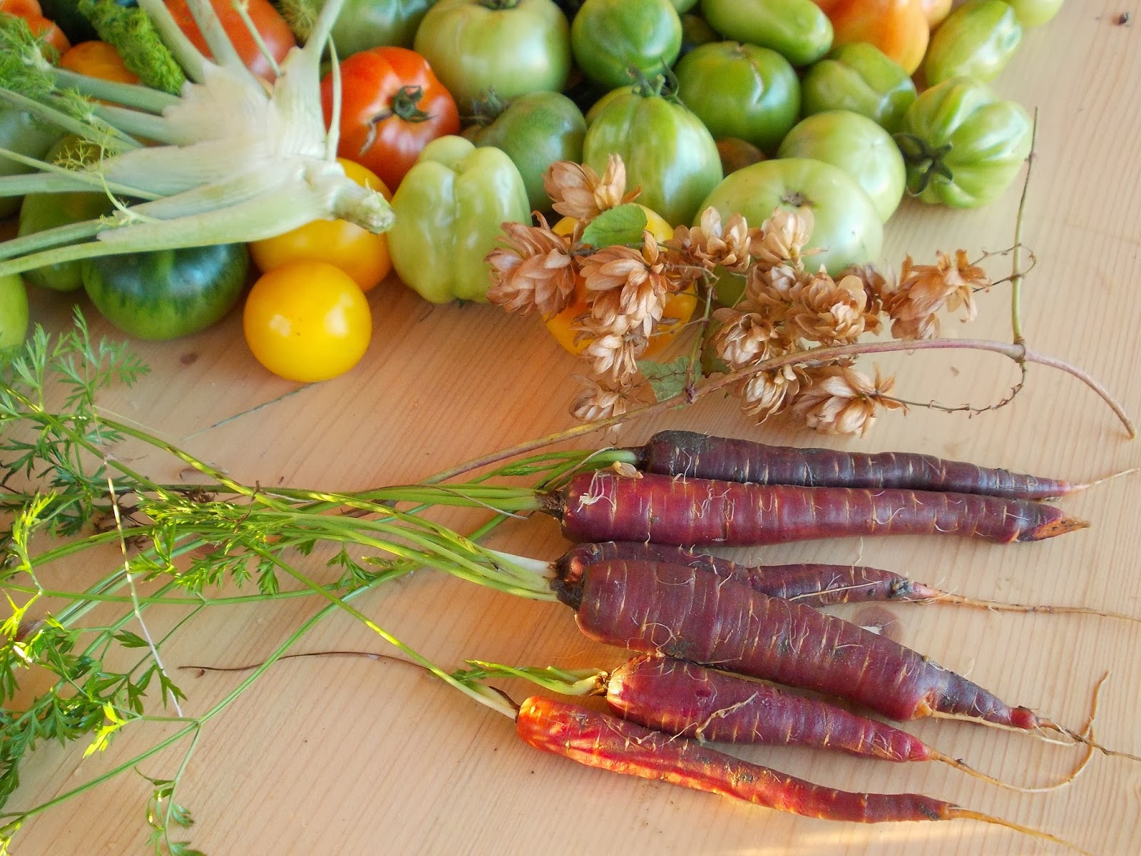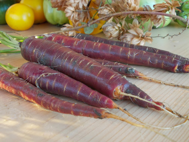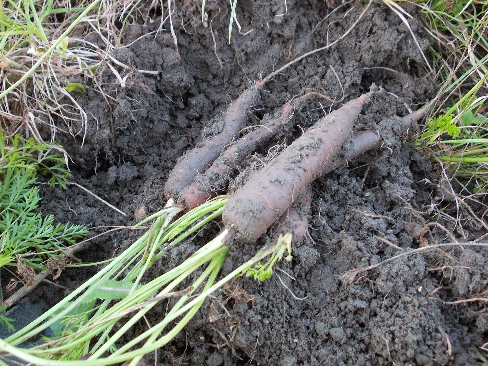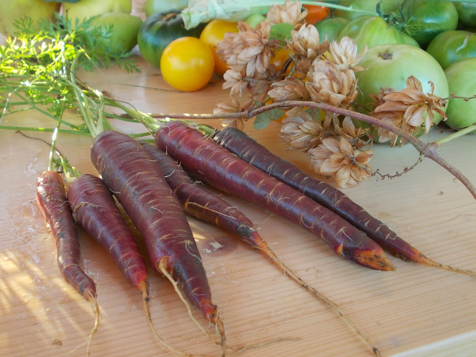 Acesta este morcovul Purple Haze, un hibrid, pe care l-am semanat in luna Aprilie, in linii aproape drepte, la distante de 30 cm. Pierdut din ochi si neglijat atunci cand au intrat in scena tomatele, a fost cautat cu insistenta de Svetlana, verificat fir cu fir, rarit, alintat si poreclit Maur Nasos, Comeata Purpurie, Resveratrol pe bat. Udat bine, si-a crescut radacina, semn ca a fost incantat de sol, soare si tratament.
